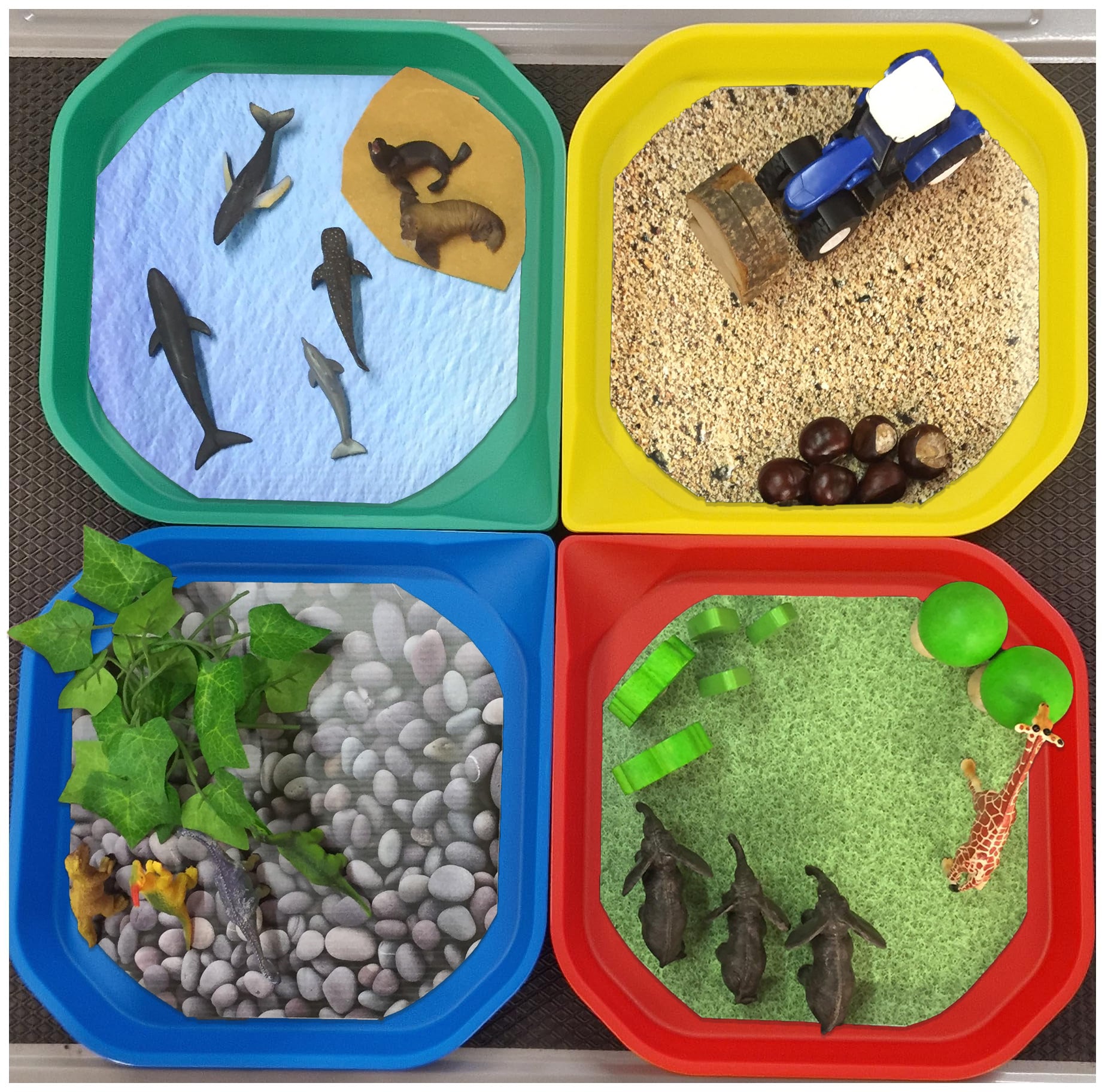 Designed to inspire creativity, children can add water, toys, beads, sand, leaves, or other sensory materials to create exciting small environments and play invitations.